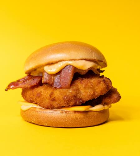 Pão Brioche, queijo cheddar, molho picante, frango frito e bacon