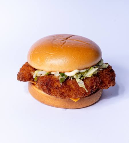 Pão brioche, queijo cheddar, maionese da casa, frango frito e salada cítrica