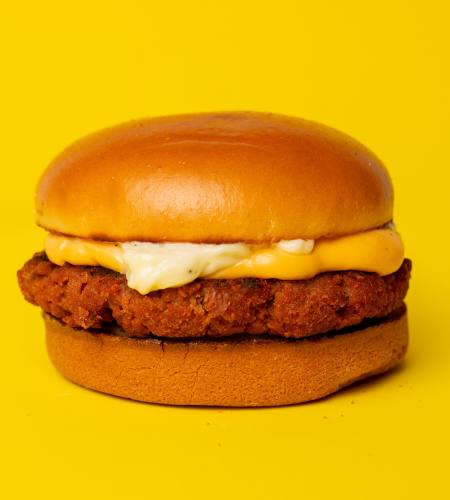 Pão brioche, carne vegetal, queijo cheddar, alface, tomate e maionese da casa
