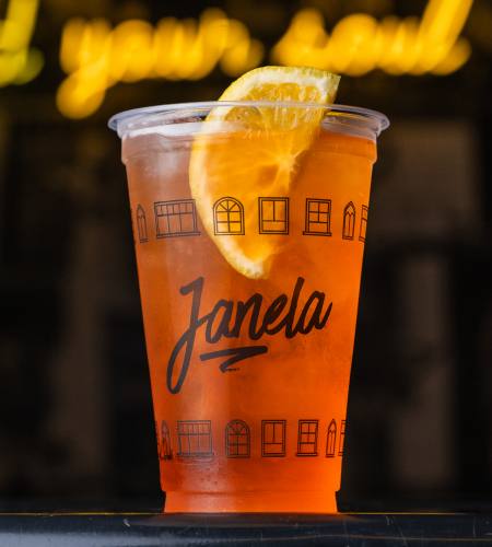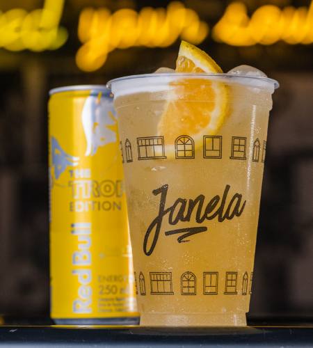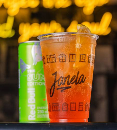 Red Bull maracujá e melão, Aperol e uma fatia de laranja.