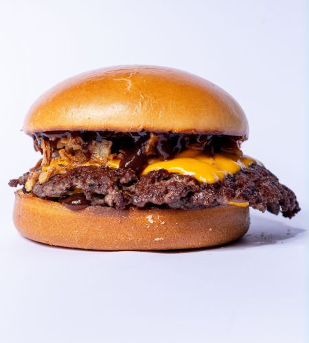 Pão brioche, dois SMASH BURGERS, queijo cheddar, molho barbecue e cebola crispy.
